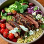 Imagine tender, grilled steak, perfectly seasoned, nestled atop a fluffy bed of quinoa or rice, topped with crisp cherry tomatoes, refreshing cucumber, and sweet bell peppers. Finished with a drizzle of creamy tzatziki sauce, this dish is a glorious symphony of textures and flavors. Whether you’re looking to impress guests or simply enjoy a cozy meal at home, this is one you’ll definitely want to pin for later!